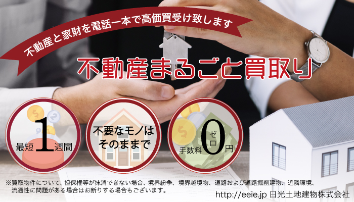※家財等の動産は 有限会社日光ビルサービス(古物商許可:大阪府公安委員会 第621211702557号)が買い受け致します。 ※居住用物件は1物件あたり8千万円まで、事業用物件は1物件あたり3億円程度まで(分筆・分割できる場合を除く)とさせて頂きます。 それ以上の額となる物件は仲介での対応となります。 ※担保権等が抹消できない場合、境界紛争・境界越境物・道路および道路掘削・建物・近隣環境・流通性に問題がある場合は お断りする場合もございます。